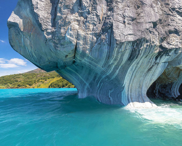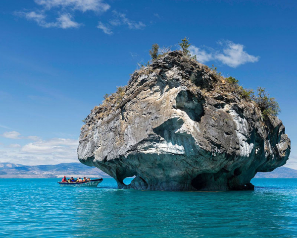 Seguiremos nuestro camino y entraremos al Portezuelo del Río Cajón (altitud 600 mt). Aquí la carretera comienza a bajar hasta llegar al poblado de Murta, situado en un brazo del Lago General Carrera. Luego, continuaremos bordeando el Lago General Carrera con sus azules aguas hasta llegar a la localidad de Puerto Río Tranquilo. Aquí realizaremos una navegación hasta encontrarnos con el maravilloso Santuario de la Naturaleza Capillas de Mármol. Este es un lugar de gran belleza escénica, en donde el constante oleaje del lago ha erosionado y ha pulido la piedra caliza dejando cavernas de diferentes formas.