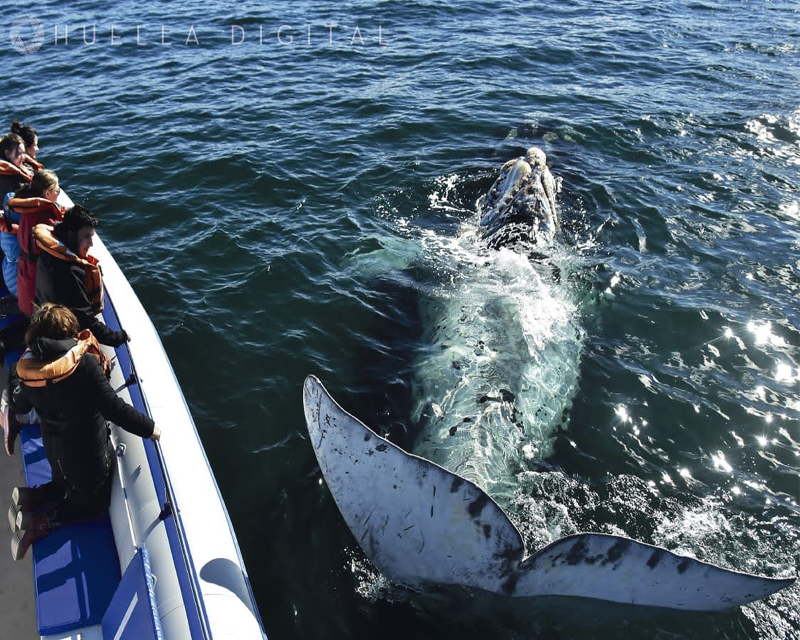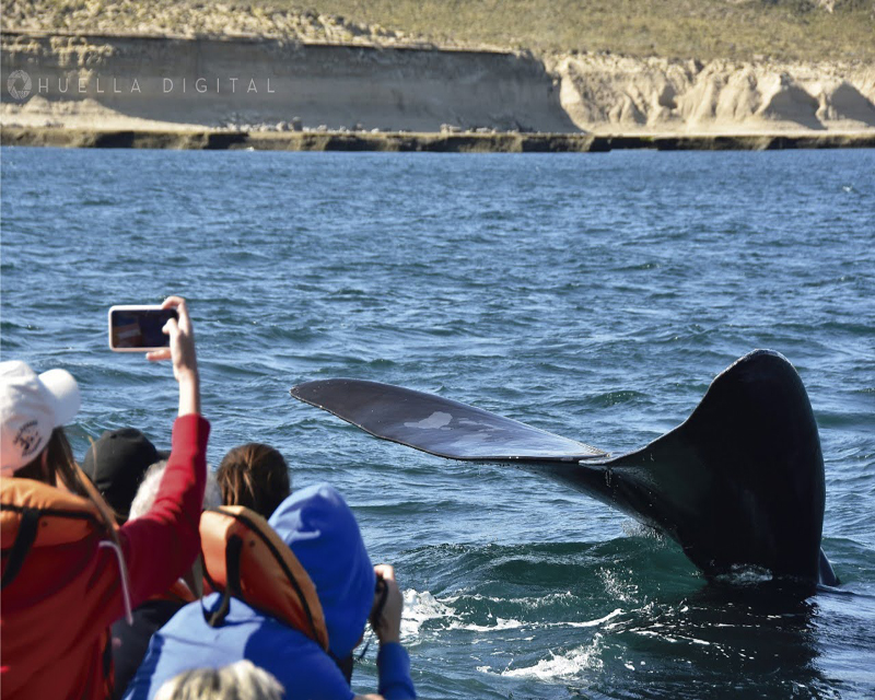 Habiendo recorrido los 100 km que separan a Puerto Madryn de Puerto Pirámides, estaremos en condiciones de embarcar en lanchas especialmente acondicionadas y preparadas para realizar el avistaje de ballenas (Franca Austral). Luego de una pequeña charla introductoria, que nos dará el Capitán y Guía de la lancha, nos ubicaremos en la embarcación que será remolcada por un tractor encargado de meternos al Mar. Comenzaremos así la búsqueda de algún grupo de ballenas; el guía nos brindará información de estos impresionantes mamíferos mientras que el capitán nos dirigirá a lo que será nuestra aproximación a ellos. Detendrá sus motores a una distancia prudente y ellas lentamente se acercaran a nosotros, permitiéndonos fotografiarlas a los lados de la embarcación, en la proa o popa. Incluso, muchas veces podremos verlas cómo pasan por debajo de la misma. Con suerte, presenciaremos a lo lejos algún impresionante salto, típico de ellas o el asomar y baile de alguna cola. La navegación tendrá una duración aproximada de una hora y media, esto dependerá de la lejanía donde se encuentre el grupo. Retornando a la costa continuaremos con el recorrido por Península Valdés.